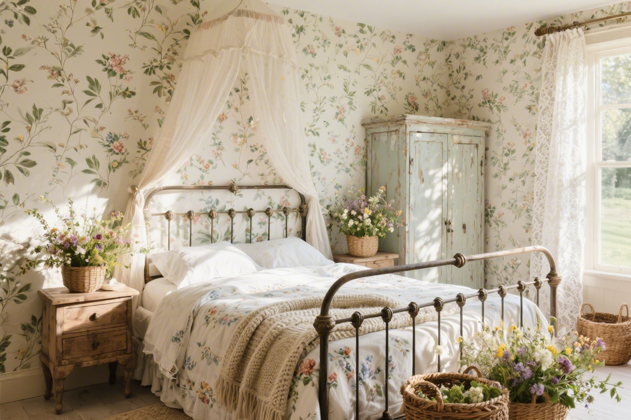 If full-on floral walls scare you, start with floral lampshades or a botanical print over the bed. Easy, low-commitment charm.